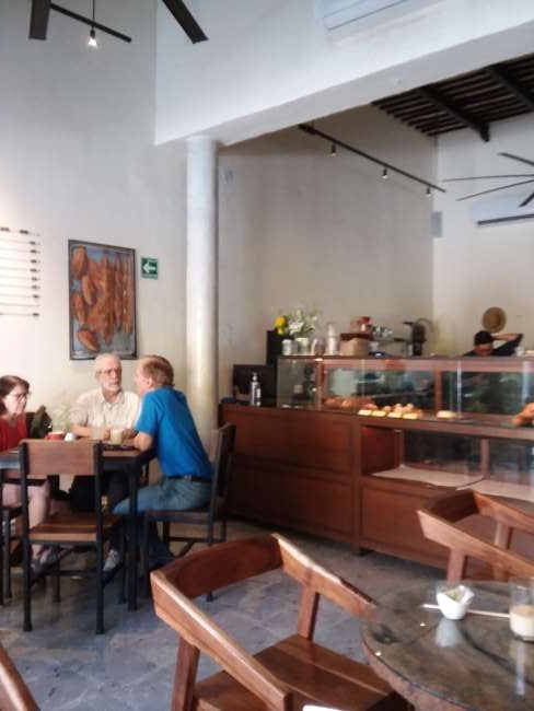 The little girl (young lady — I’m getting old) behind the counter had fun with me. I am subjecting everyone to my attempts at Spanish, and I’m often coaxed along like a toddler trying to get from the coffee table to the couch. I asked in barbarous Spanish the correct word (palabra) for a bagel they had in the case, and the girl smiled coyly at me and said, “bagel.” My wife had some sort of cinnamon roll taken up fourteen notches. The food was so good, I went back for lunch and got sandwiches to go, and was rather proud of myself when I ordered them in Spanish. By the way, if you want to order sandwiches in Mexico, the word for sandwiches in Spanish is sandwiches. You’re welcome.