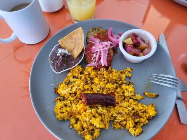 Mayan food is very strange to us. It has nothing to do with the usual Taco Bell stuff Americans think of when Mexican food is mentioned. It all looks like a big mess on the plate, and it’s hard to decipher exactly what you’re eating. I have to be careful, because I’m allergic to things that can kill me in a few minutes, so street food is too dicey a proposition for the most part. But we try this and that in restaurants after explaining the gustatory sword of Damocles that hangs over me. The staff of the Maya Chuc did the impossible in this regard. They convinced me to try this: