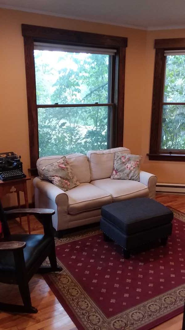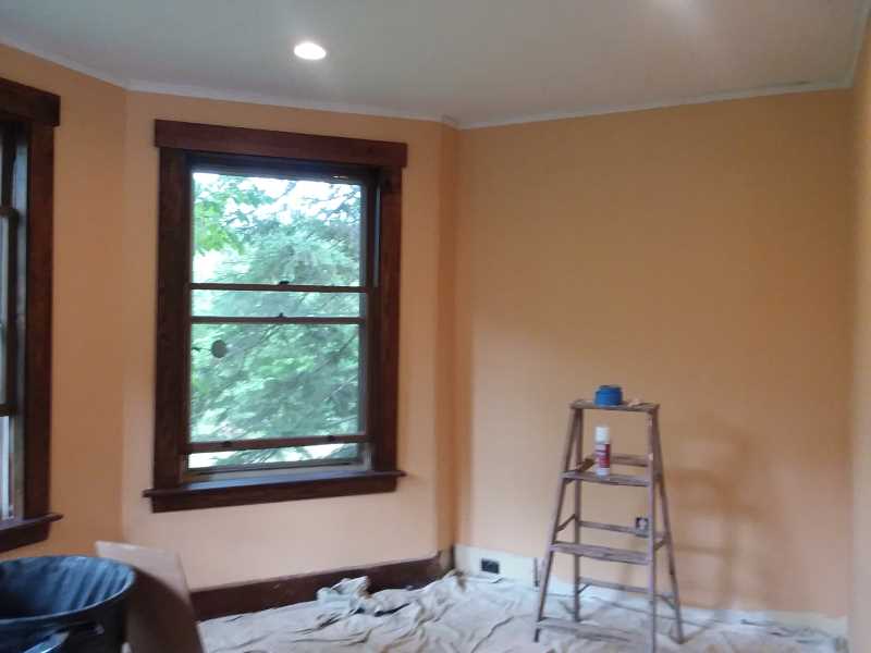 We refinished the woodwork after stripping off the errant paint. I suspect that all the oak trim in our house was this dark walnut color at one time. This is the last room where it hasn’t been altered. This is the “cutting in” stage of painting. If you’ve ever listened to a painting crew at work, everyone fights over the roller. No one wants to cut in. The roller is like the front passenger seat on a road trip. You have to call it early.