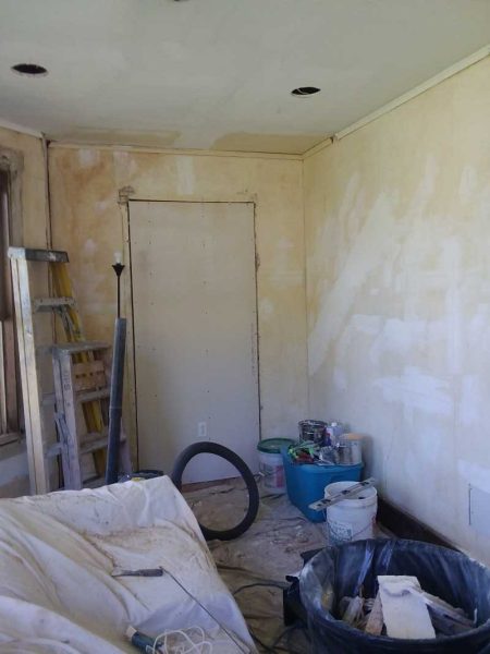 OK, so we’re back to square one here. We brought the demolished frescoed drywall to the dump, where they’re probably still scratching their heads over us. We’ve revealed the back of the bifold door that served the closet we just removed. Interestingly, that doorway was always there.