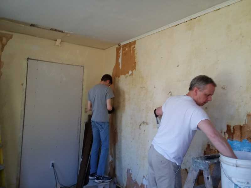 Wallpaper steamers were once big propane-fired boilers that sat in the middle of the room and made Mike Mulligan noises. You had to rent them by the day, and they made gouts of steam, I tell you what. It was a good job to undertake in February. Not so much in July. Nowadays, you can buy a little steamer for a few quid and it works well enough. You can use the little kettle and hose to make a steam box to bend wood, too. I have. My wife is constitutionally incapable of taking a photograph, but I’m holding the steamer “plate” in my left hand, and squeezing adhesive out of a sponge with my right. The spare heir is sleeping in the corner, I think.